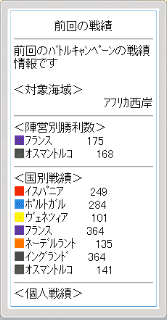・ 前回のバトルキャンペーンについて、対象海域、陣営別勝利数、国別戦績、個人戦績ランキングを見ることができます。