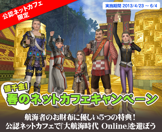 4月23日より『大航海時代 Online』公認ネットカフェにて「値千金! 春のネットカフェキャンペーン」を実施します。本キャンペーンでは、交易を有利に運べたり、航海の諸費用を無料にしたりといった、航海者の“お金”にまつわる“値千金”の特典をご用意しました。この春は、公認ネットカフェで『大航海時代 Online』を楽しみましょう!