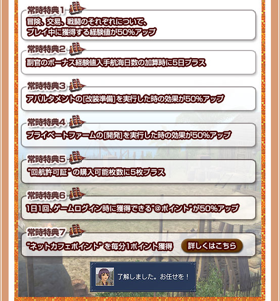 公認ネットカフェで『大航海時代 Online』をプレイすると、以下の特典を得ることができます!