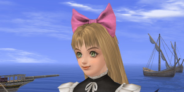 頭頂部に着ける大きなリボンです。耐久度100、防御力5、社交[+1]、応急処置[+2]。