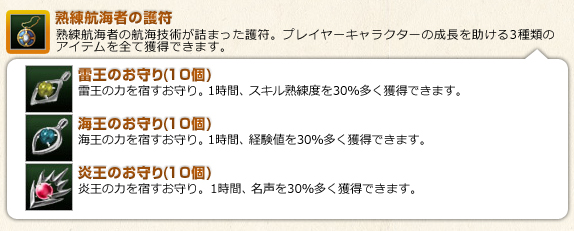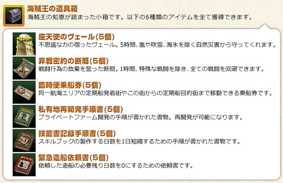 特典アイテムシリアルナンバーを、ゲーム内の「シリアルナンバー入力」から入力すると、特典アイテムを獲得できます。 ・海賊王の道具箱 / 熟練航海者の護符 / 匠の船部品発注書 |