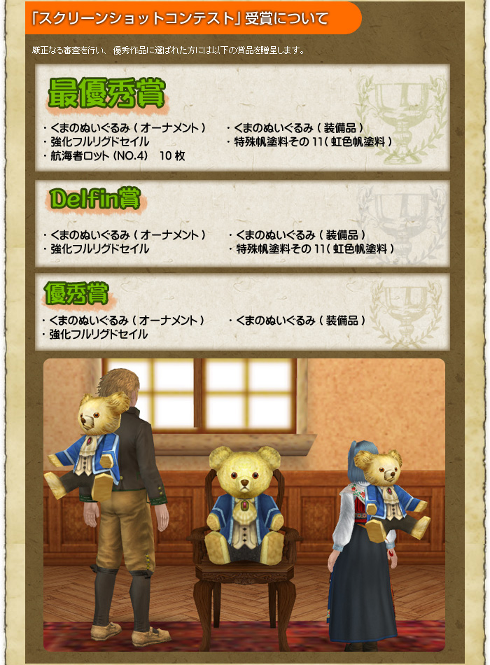 • ・ 入賞作品はワールド名、キャラクター名、作品タイトル、作品コメント、応募作品(スクリーンショット)が公式サイトにて公開されます。基本的にはご応募いただいた内容をそのまま公開しますが、弊社にて適した形に編集する場合があります。ご了承ください。