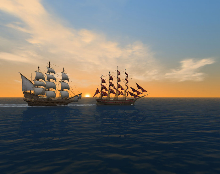 夕陽をバックに2隻の帆船が航海をしている姿がとても美しいです。また、2隻の帆船もそれぞれ白と赤をメインとした赤白の網目模様と異なる色の帆となっており、そのコントラストがとても良いです。