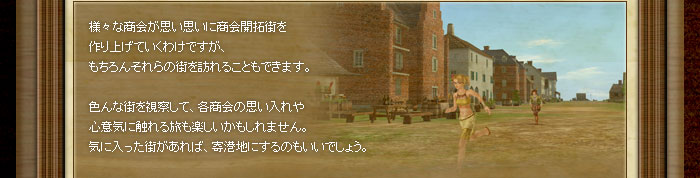 商会開拓街では街ごとに産出される交易品の種類や数が異なります。また、発展のさせかたによっては、開拓街でしか購入できない北米の名産品が交易所に並ぶ可能性もあります。