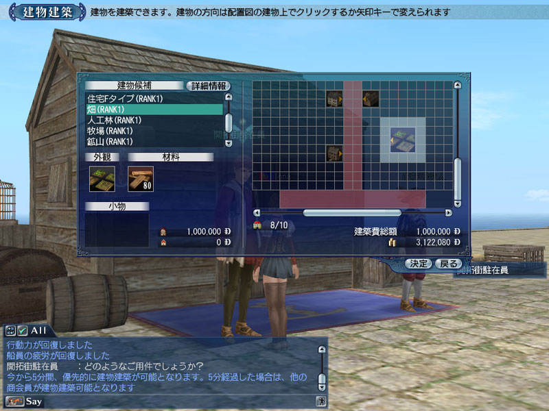 商会開拓街は、初期段階ではまっさらな大地です。そこに様々な建物を自由に建築して、街を作っていきます。