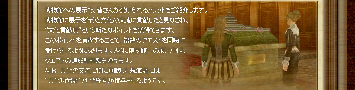 博物館は皆さんの冒険の成果を披露する場で、苦労して発見した異国の品々を展示したり、他の航海者の展示物を閲覧したり、といったことができます。