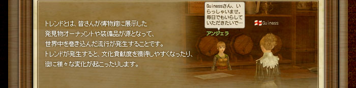 トレンドは源となった展示物を置いたプレイヤーキャラクターの所属国(本拠地)で発生します。もちろんその時に発生するトレンドは、源となった展示物の文化圏です。例えば、フランスの航海者が博物館に安土城のオーナメントを展示し、それを源としてトレンドが発生した場合、マルセイユの街で日本文化が流行する、といった具合です。