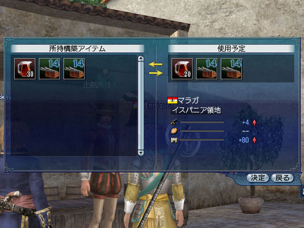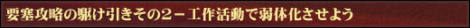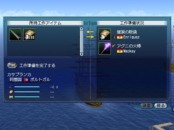 強固な要塞を陥落させるには工作活動を行って、要塞の弱体化を進めるのが効果的です。工作は要塞の耐久度などの各数値が一定以上ある場合に仕掛けられます。会戦中に工作活動に必要なアイテムを所持して、敵勢力の要塞がある街に入港すると、工作が可能となります。工作を達成すると、要塞の各数値が減少します。