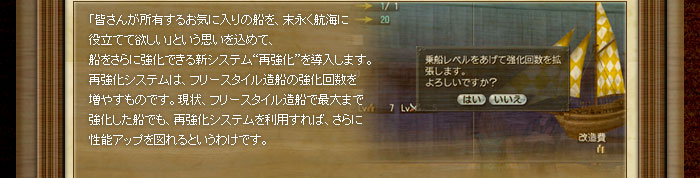 船の再強化は商会開拓街の造船所で行います。船に再強化を行うとフリースタイル造船の強化回数が増えるので、皆さんの愛船を目的や理想に沿った姿へとさらに近付けられます。
