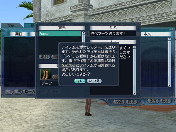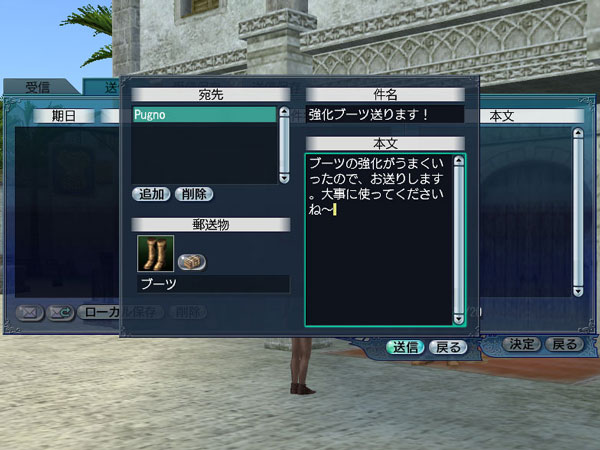 各街にいるNPC“道具屋主人”から、1日1回、《郵送箱》が購入できるようになります。《郵送箱》を所持した状態で新規メール作成をすると、所持品をそのメールに添付できるようになります。フレンドや商会員にサプライズな贈り物などいかがでしょうか?