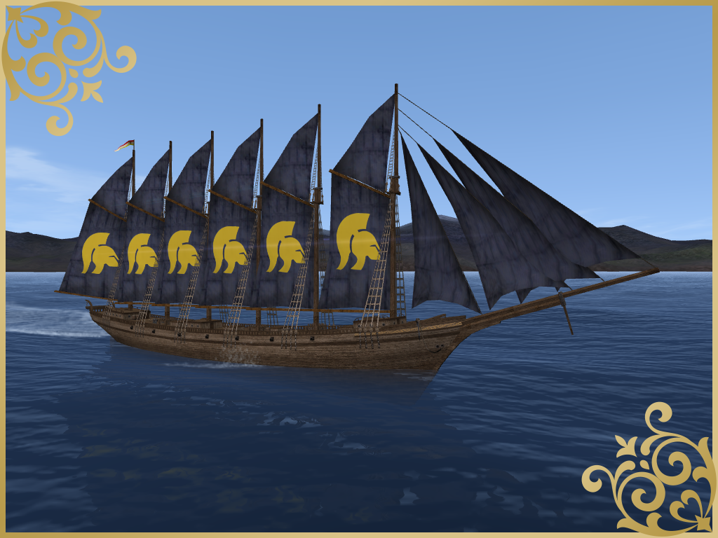 6本のマスト全てに縦帆を艤装したスクーナー。末尾のマストにのみ旗があるのが特徴です。