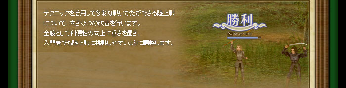 入門者から上級者まで、幅広いプレイヤーに陸上戦をお楽しみいただけるよう、戦闘テクニック“フェイント”の強化を始め、様々な修正やバランス調整を行います。