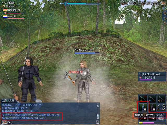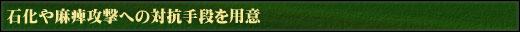 石化や麻痺、毒などの状態変化攻撃を受けても、“耐えて効果を受けない”といったケースが発生するようになります。また、石化などでプレイヤーキャラクターが操作できない状態になっても、《解毒剤》など“陸戦状態回復”の効果があるアイテムのみ、使用できるようになります。アイテムスロットに登録しておけば、もしもの時に役立つでしょう。