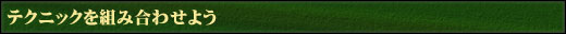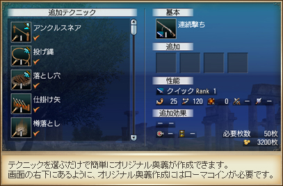 最初に基本となるテクニックを選びます。続いて、基本テクニックに組み合わせる追加テクニックを、最大で4つまで選択します。追加テクニックの組み合わせによっては、特殊な効果が付いたりします。