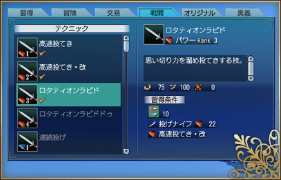 狙撃術 / 投てき術 / 罠 / 商品知識 / 応用剣術