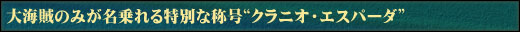 “クラニオ・エスパーダ”は、航海者たちを震え上がらせる大海賊のみが名乗れる称号です。その称号を名乗るには余りにも背負うものが重く、名立たる海賊たちであっても、ためらうほどと言われています。我こそはと思う方は、海賊たちが集う島で名乗りを上げてみてはいかがでしょうか。