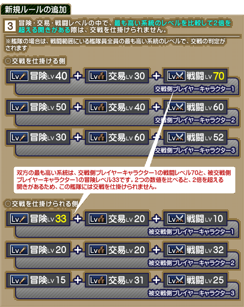 遠洋に漕ぎ出す初級航海者の皆さんが安心して航海できるよう、海賊プレイヤーが他のプレイヤーに戦闘を仕掛けられるルールを、以下の通り変更します。このルールは危険海域と無法海域の両方に適用します。