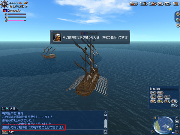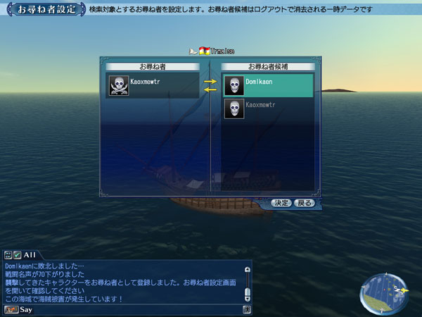 海賊プレイヤーから襲撃を受け、船を沈められるか、上納品を差し出す事態になった場合、その海賊プレイヤーが“お尋ね者”として登録されます。