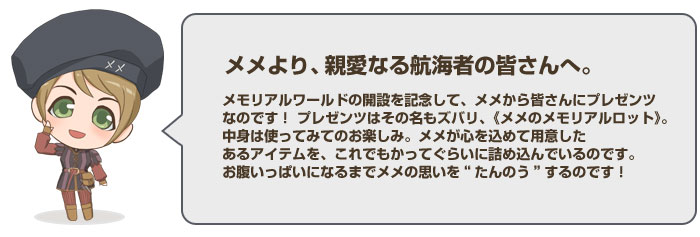 ³Æ¹ñ¤ÎËܵòÃϤι¾ì¤Ë¤¤¤ëNPC¡È¥á¥á¡É¤ËÏ䷳ݤ±¤ë¤È¡¢¡Ô¥á¥á¤Î¥á¥â¥ê¥¢¥ë¥í¥Ã¥È¡Õ¤ò1Æü1²ó¼õ¤±¼è¤ì¤Þ¤¹¡£¢¨ËܵòÃϤϥꥹ¥Ü¥ó¡¢¥»¥Ó¥ê¥¢¡¢¥í¥ó¥É¥ó¡¢¥ô¥§¥Í¥Ä¥£¥¢¡¢¥Þ¥ë¥»¥¤¥æ¡¢¥¢¥à¥¹¥Æ¥ë¥À¥à¤Î6¥ö½ê¤Ç¡¢¥¤¥¹¥¿¥ó¥Ö¡¼¥ë¤Ï½ü¤¤Þ¤¹¡£