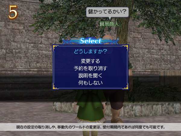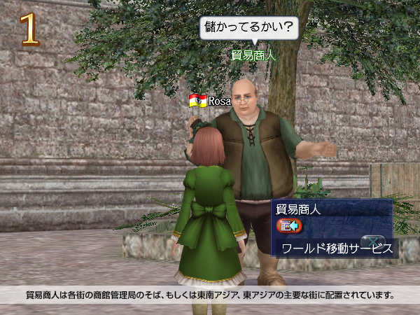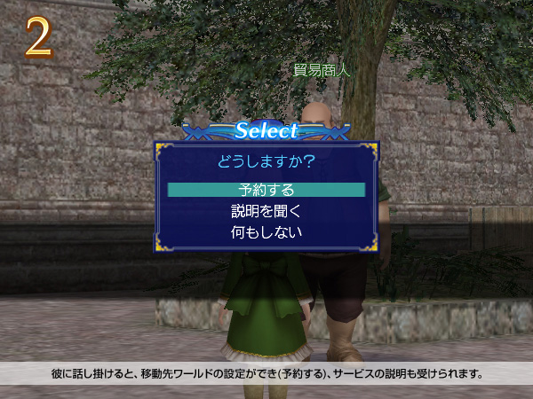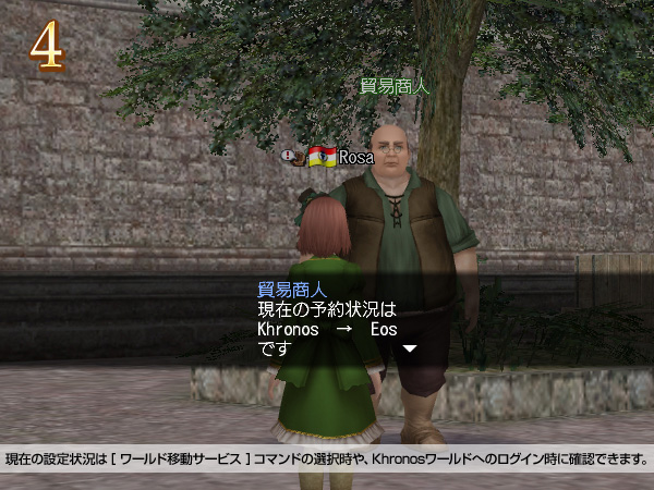 「ワールド移動サービス」は、NPC“貿易商人”にて受けられます。移動先のワールドを設定したいプレイヤーキャラクターでKhronosワールドにログインした後、以下を参考に移動先のワールドを設定してください。