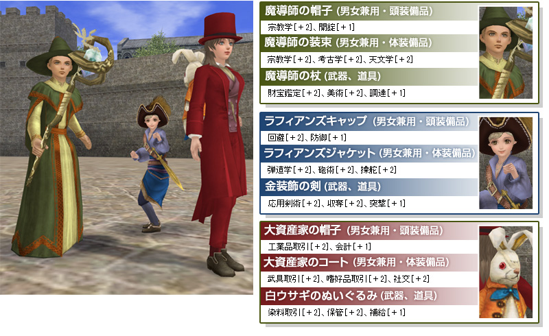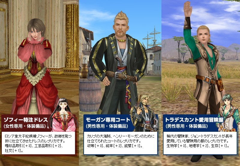 「2nd Age」までに登場した16名の著名人たちが身に着けている特別衣装(装備品)の色違いを作成できます(縫製スキル:ランク16)。
