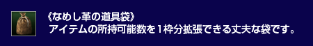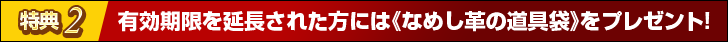 - 特典2のプレゼントは以下の通り、実施します(お手続きは不要です)。実施日時以降、銀行の[ アイテム受領 ]コマンドで《なめし革の道具袋》を受け取ってください。配布予定は、都合により変更される場合がございます。あらかじめご了承ください。
