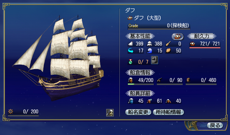 スキル効果:鋳造[+3] 火器取引[+3] 航行技術[+2] 装備効果:航行速度上昇[ランク8] |