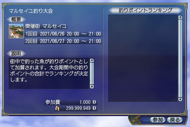 開催期間の1時間前から大会終了までの間、開催街のNPC「出航所役人」または「出航所案内人」の「釣り大会」コマンドから参加できます。
