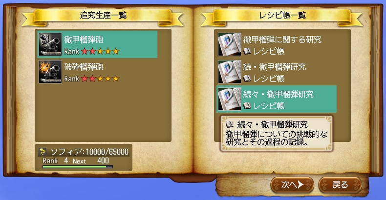 「習熟度」が一定以上になると、「分類」のランクが上がり、さらに強力な大砲の生産レシピが使用できます。
