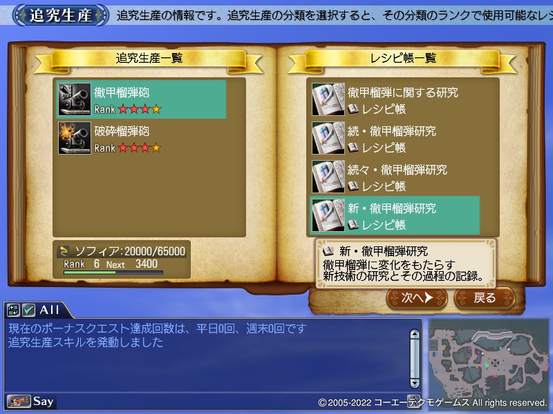 分類の最大ランクが解放されることで、再び「習熟度」が獲得できるようになります。「習熟度」が一定以上になると、「分類」のランクが上がり、さらに強力な大砲などの生産レシピが使用できます。