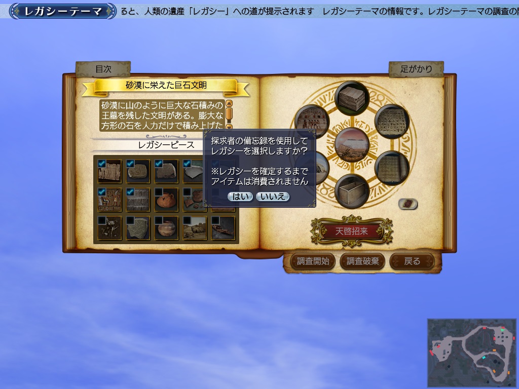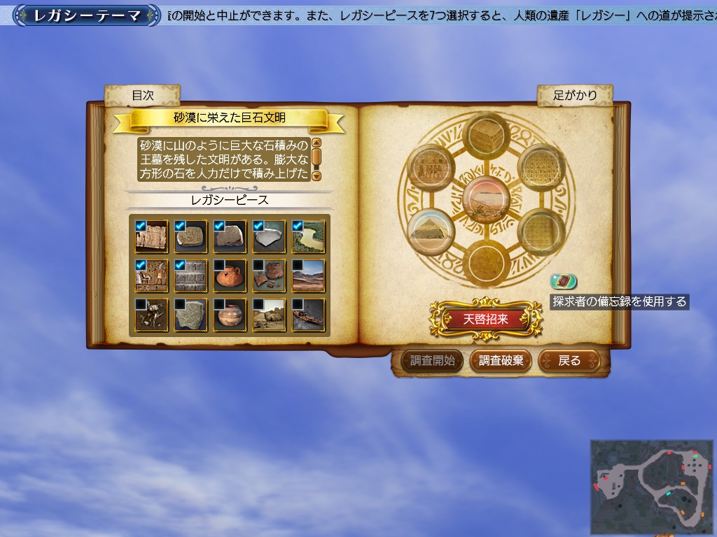 ※レガシーの調査を始める前には、酒場マスターに話しかけて「叡智の書」を手に入れる必要があります。