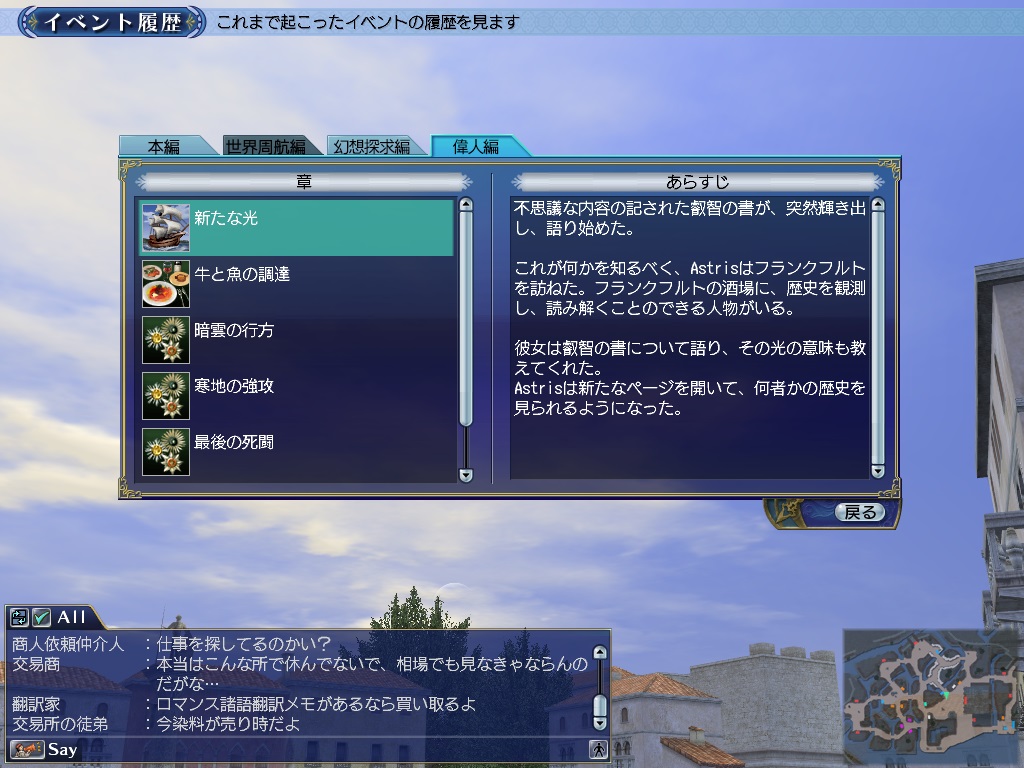 メニュー「記録」の「イベント履歴」を選択すると、「偉人編」で完成した列伝のあらすじを確認できます。