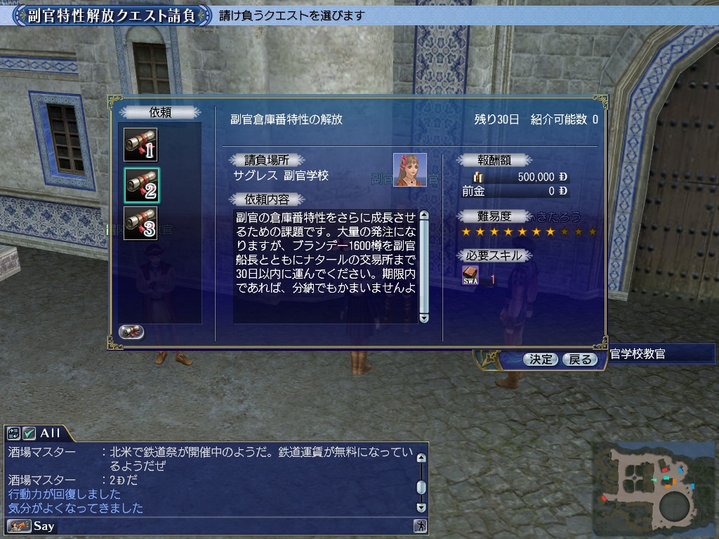 ※入港許可証が足りない場合、副官は特性が100になってもクエストを請負えないこともあります。