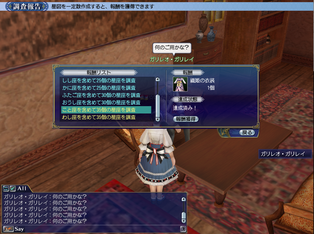 指定星座を含め一定数の星座調査を完了すると、“ガリレオ”から新たな報酬を獲得できます。