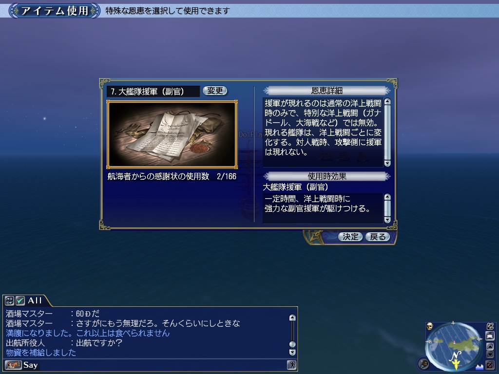 なお、賞金首のプレイヤーは「航海者からの感謝状」の恩恵リストの中から【大艦隊援軍(副官)】を選択することはできません。