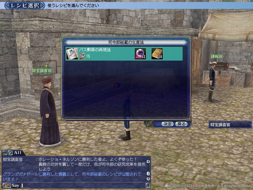 司令部の財宝調査官に話しかけると、直前に倒したグランデガナドールの種類に対応したレシピが公開されます。このレシピは1度に1回だけ利用できます。