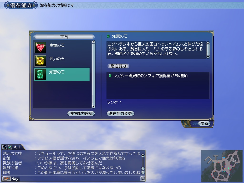 入手した宝石と有効中の潜在能力は、人物メニューの「潜在能力」から確認できます。