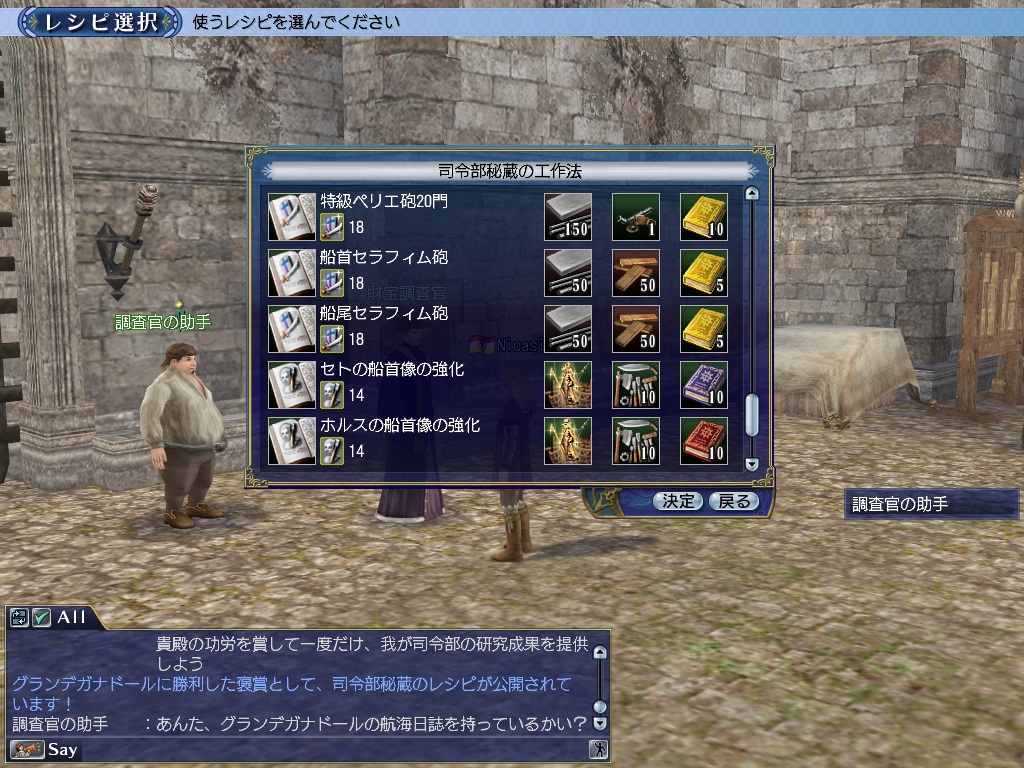 司令部の財宝調査官に話しかけると、直前に倒したグランデガナドールの種類に対応したレシピが公開されます。このレシピは1度に1回だけ利用できます。