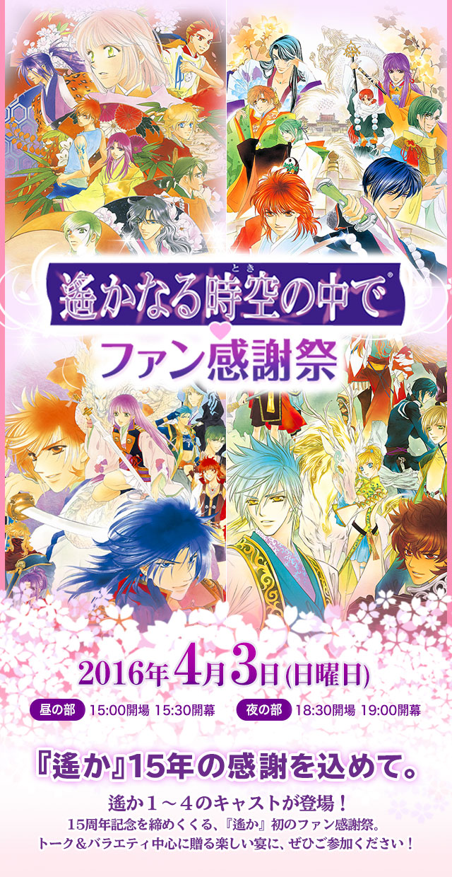 皆さまのおかげをもちまして、2016年4月3日昼夜2公演にわたる 「遙かなる時空の中で・ファン感謝祭」を大成功のうちに終えることができました。