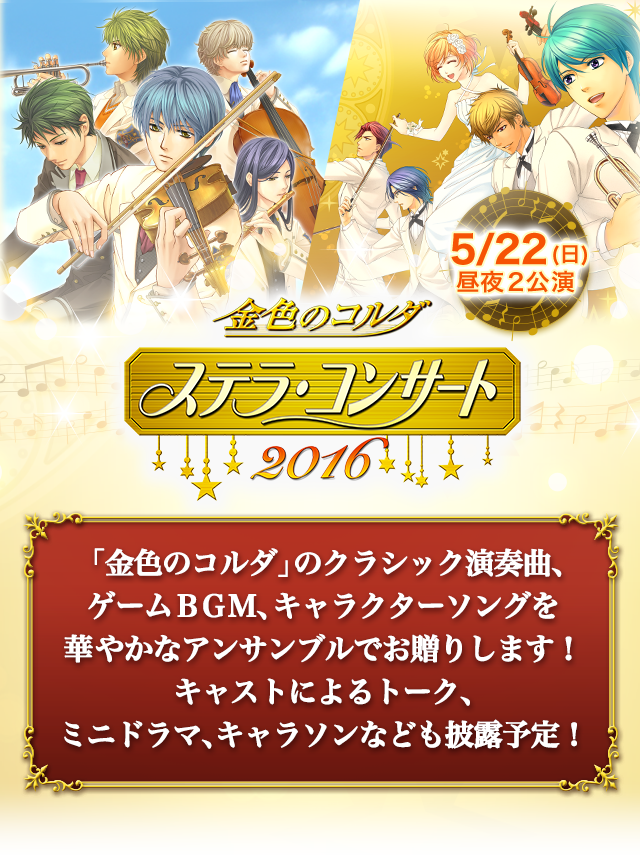 皆さまのおかげをもちまして、5月22日昼夜2公演にわたる 「金色のコルダ ステラ・コンサート 2016」を大成功のうちに終えることができました。キャスト・スタッフ一同、深く感謝いたします。