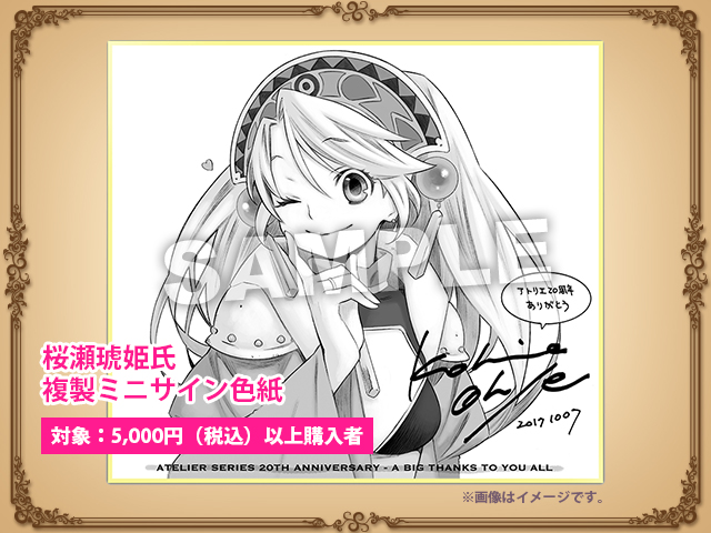 桜瀬琥姫氏 複製ミニサイン色紙 対象:5,000円(税込)以上購入者 サイズ:約120×135mm 『マリーのアトリエ』イラストレーターである桜瀬琥姫氏が、アトリエ20周年フェスティバルのために描きおろして下さったミニサイン色紙です! ※ガストくじは対象外となります。 |
