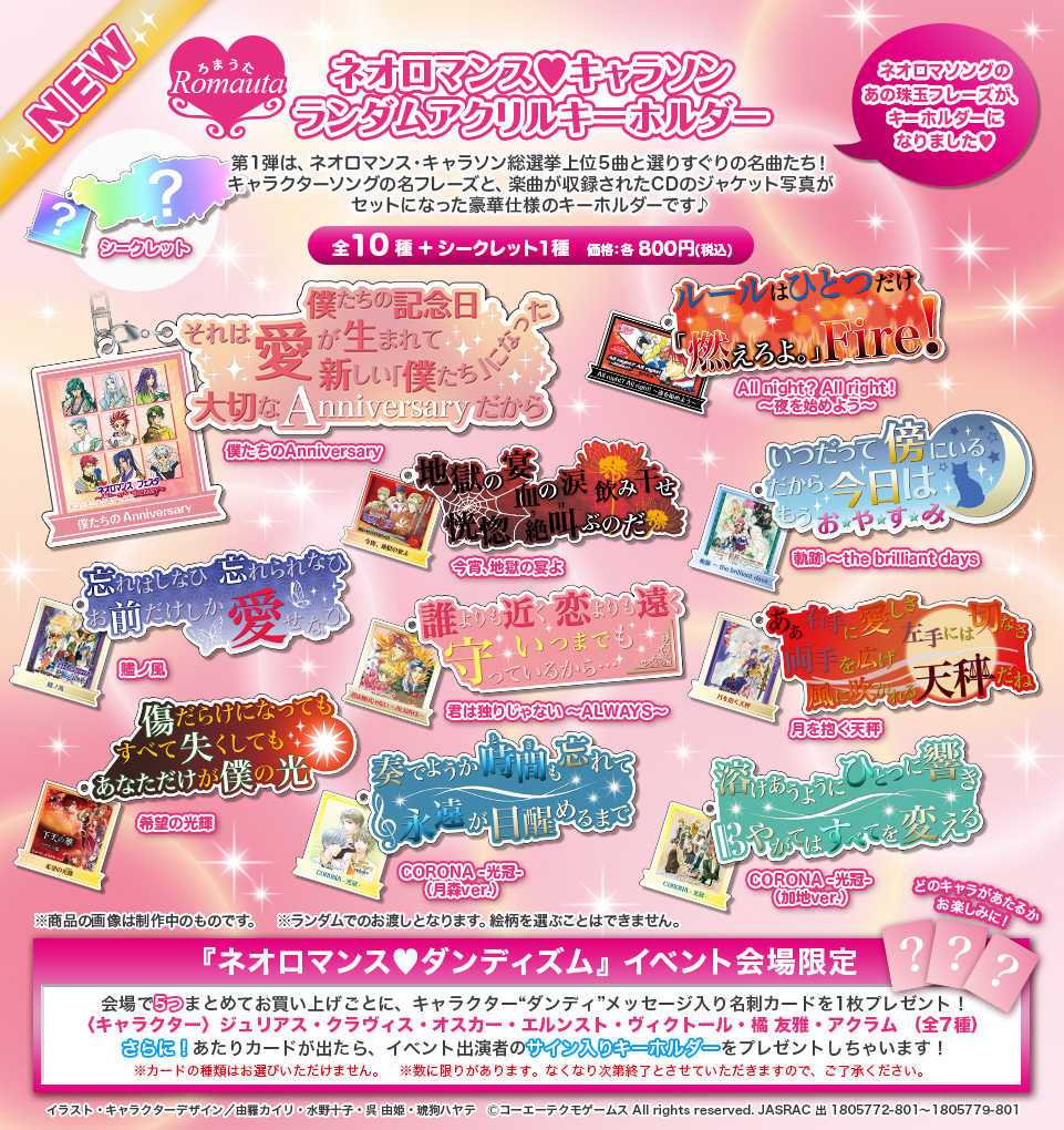 ネオロマンス・キャラソン ランダムアクリルキーホルダー(全10種+シークレット1種)【価格】 800円※購入時にはランダムでのお渡しとなります。 ※5つまとめてお買い上げごとにイベント会場限定特典「キャラクター“ダンディ”メッセージ入り名刺カード」1枚プレゼント