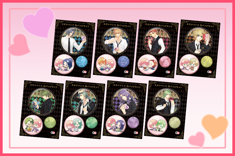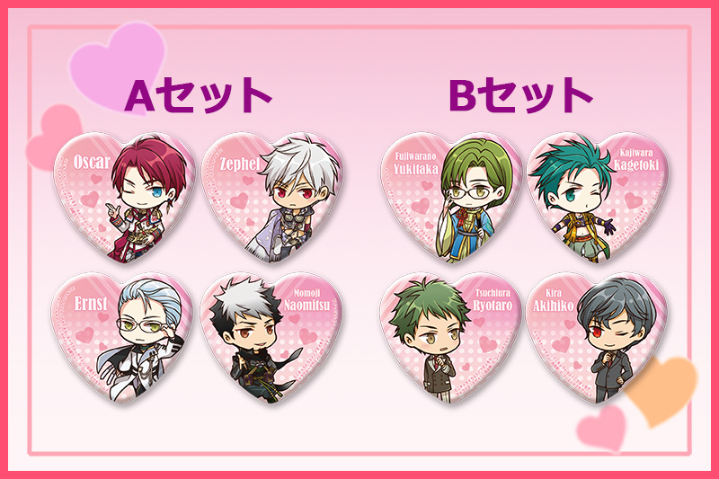 ア・ブ・ナ・イ♥ネオロマンス ハート缶バッジ4個セット(全2種)【価格】 各1,600円(Aセット…オスカー&ゼフェル&エルンスト&百地尚光/Bセット…藤原幸鷹&梶原景時&土浦梁太郎&吉羅暁彦)素材:PET、紙、ブリキ サイズ:約57×52mmミニキャライラスト/アオイ冬子