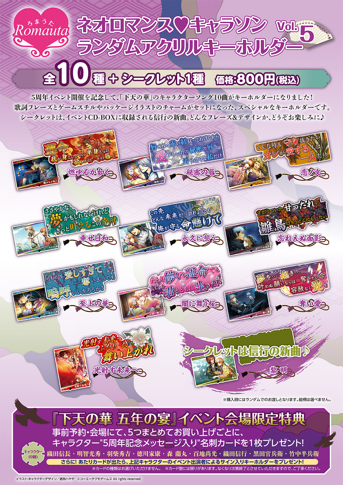 5周年イベント開催を記念して、「下天の華」のキャラクターソング10曲がキーホルダーになりました!
