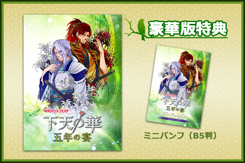 ネオロマンス♥フェスタ 下天の華 五年の宴 パンフレット 豪華版【価格】 4,500円「五年の宴」開催を記念したスペシャル版。全出演者を3組に分けての座談会3本を撮り下ろし写真とともに収録! 他の出演者やキャラクターについての印象を聞いたインタビューも掲載。