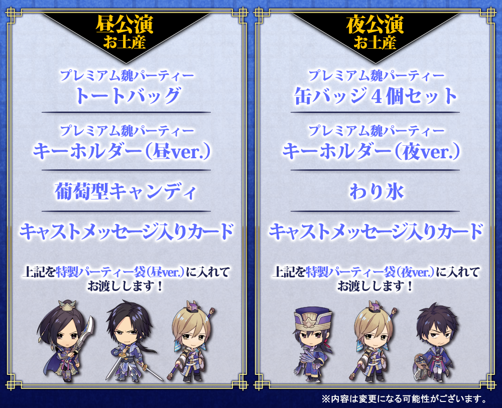 『「真・三國無双」プレミアムパーティー feat.魏 次代を拓く叡知の宴』開催当日に、昼公演と夜公演の、両方のチケットを夜公演開場後に、受付までお持ちください。