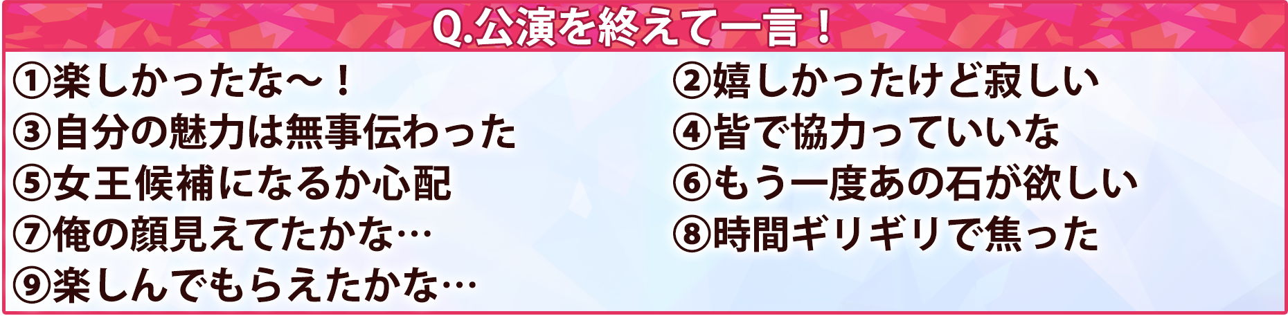 キャストのみなさま、各方面スタッフのみなさま、そして何より、女王候補のみなさま。本当にありがとうございました!
