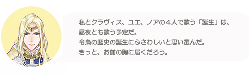 そこで、ジュリアス(速水 奨)、クラヴィス(田中秀幸)、ユエ(土屋神葉)、ノア(七海ひろき)の4人で 「誕生*」を歌っていただきます!