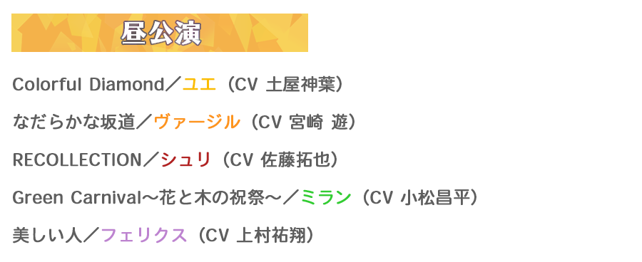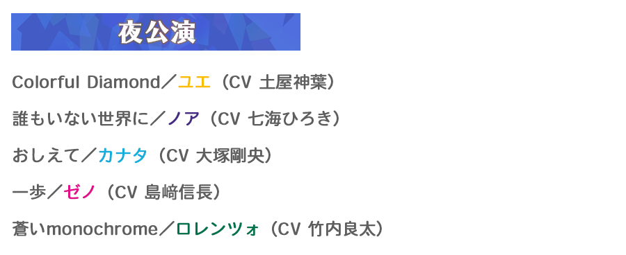 後半のライヴコーナーでは、ゼノ(島﨑信長)の「一歩」、ノア(七海ひろき)の「誰もいない世界に」、ユエ(土屋神葉)の「Colorful Diamond」が披露されました。
