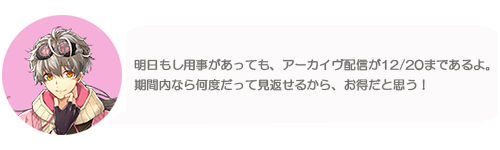 12/13(日)以降も、アーカイヴ配信視聴終了日の12/20(日)までは、ツイートを残しておくので「12/13(日)は予定が……」という方も大丈夫! ぜひ、イベント当日と合わせて楽しんでくださいね。■12/13(日)15時より昼の部、21時より夜の部の配信を再生してください。